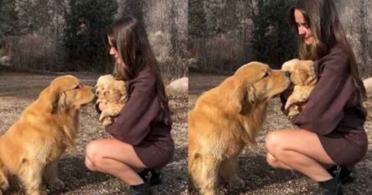 La tierna reacción de un golden retriever al conocer a sus cachorros por primera vez
